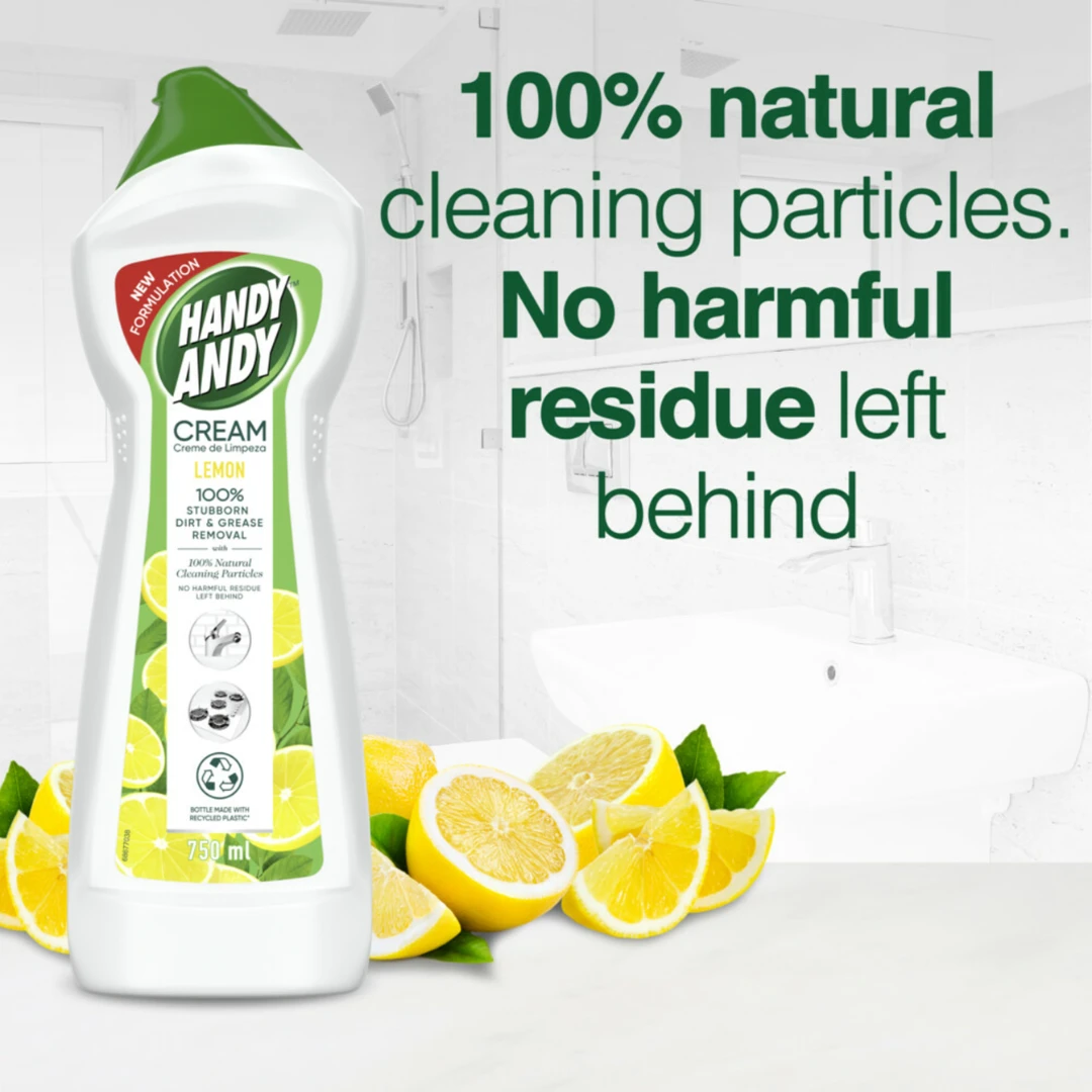 Handy Andy Lemon Multipurpose Cleaning Cream contains 100% natural cleaning particles that remove 100% of the most stubborn dirt and grease, and is easy to rinse with no harsh residue left behind. Daily household cleaning has never been easier with Handy Andy.