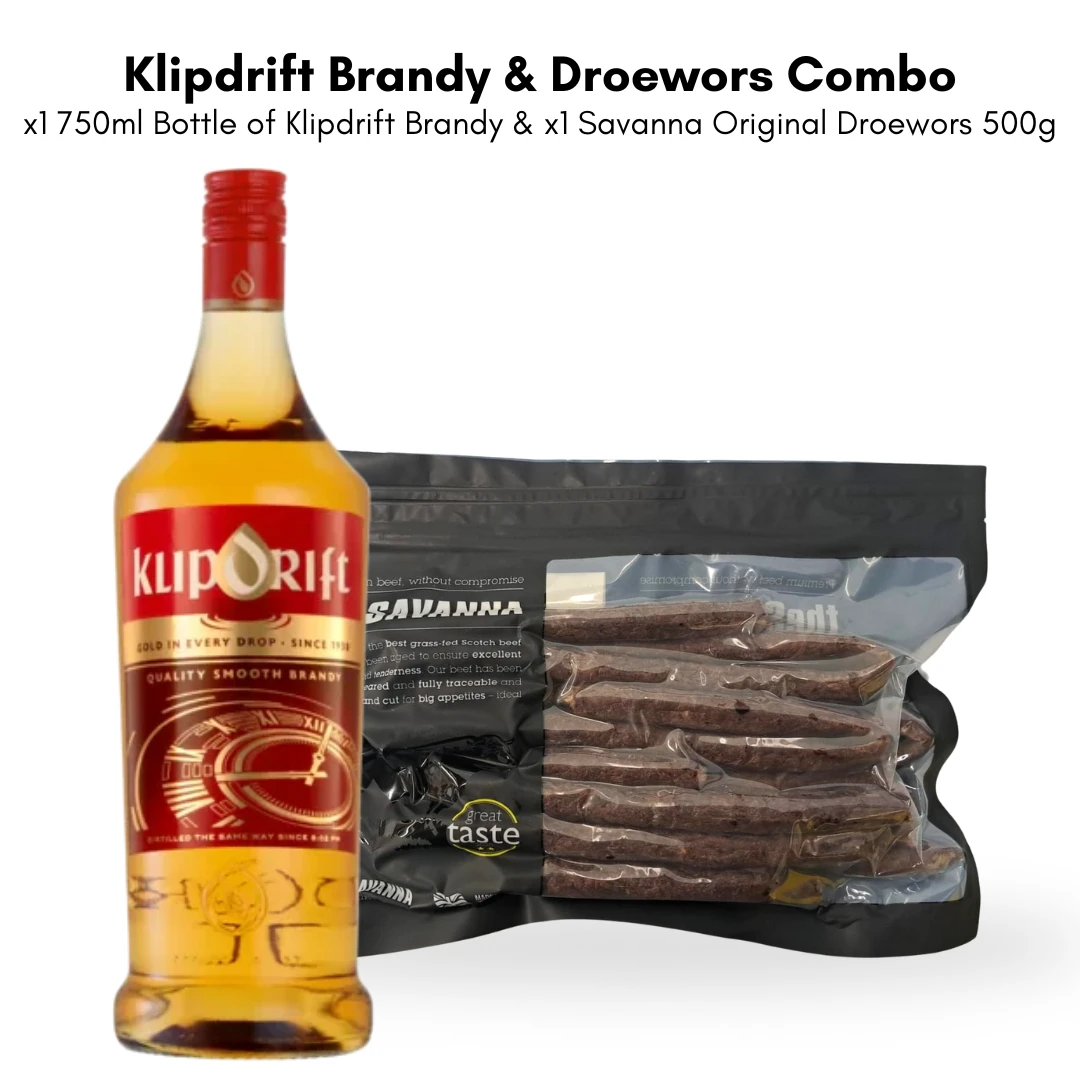 Our combo includes the South African classic, Klipdrift brandy, the perfect accompaniment to our extremely popular original droewors.